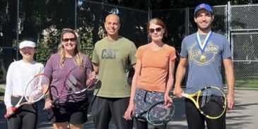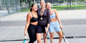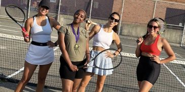 This isn’t the "Tennis Edition of Charlie’s Angels", it’s the NTRP 1.5-2.0 Challenger on July 8. Reem Keleta (front) won the challenger winning 12 games, Rachel Dhingra (left most)won 6 games, Nicole Britton (right most) and Stephanie Algieri (second from right) won 4 games each.